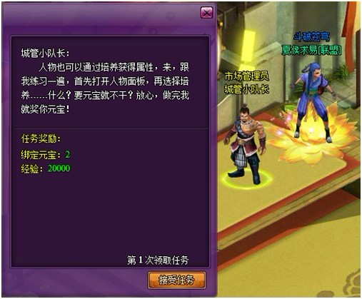5. 增加循环性的消费引导任务,在帝都NPC—城管小队长处领取任务,任务内容随机,完成后可获得绑定元宝和经验,每天可完成10次。