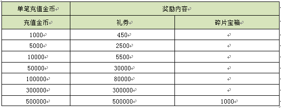 活动内容:活动时间内,单笔充值订单充值金额满足以下条件即可获得相应礼包一份,多次充值可以多次领取奖励!