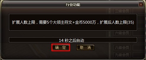 增加提升行会最大人数上限功能,每添加5个行会成员上限,但需要交纳5个大领主符文+5000万金币,添加行会成员上限的操作,必须由行会会长操作具体操作如下: