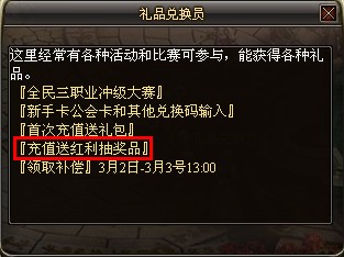 活动内容:每充值10元宝可以获得1点红利,使用红利可以在春之城(53.51)礼品兑换员处兑换超值道具。