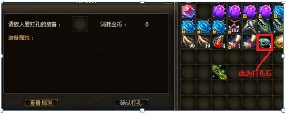 2. 给装备打孔时需要使用打孔石。打孔石能为任意装备任意孔数打孔,且每次只需要1个打孔石,只能开启1个孔。