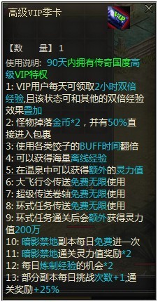 新增道具:高级VIP季卡 商城售价:1380元宝 道具说明: