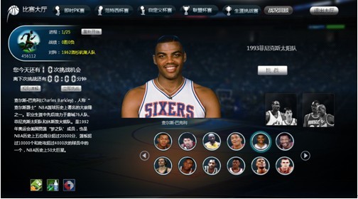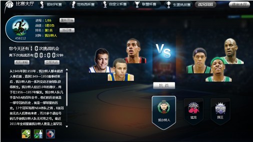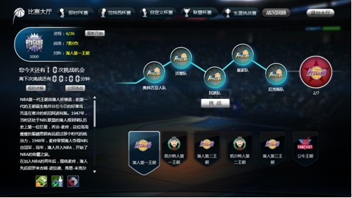 生涯挑战赛一共分5个级别,采用快速比赛的模式,不消耗您球队中球员的任何体能,即使挑战失败也不会有任何惩罚。在这里,您会亲身体验到打败实力强劲的对手的那种无可匹敌的壮志豪情,让您亲历从击败美国大学生联赛NCAA的球队,一直到挑战NBA名人堂球队乃至湖人王朝、公牛王朝获取成功时那种紧张刺激的快感,您准备好参赛了吗?