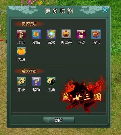行军打仗少不了战略,如何用最短的时间和策略让敌人溃不成军,充分的发挥战场上每一个人的最大功能,让战场变成你的主场。陪游《盛世三国》有很多的功能。例如:包裹功能、邮箱功能、任务功能、技能功能、好友功能、社会功能、宠物功能、铸造功能、商店功能和更多功能。更多功能之所以这么叫的原因是因为游戏的页面有限,还有许多的功能不能一一的放在游戏的页面上,只好把其它的一些功能放在了更多功能里面。更多功能里面有一些许多的玩法和系统帮助。玩家们如果需要的话就打开心看一看,说不定对你有帮助哦!